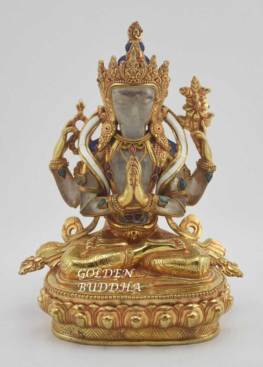 Our Nepali master artisan created our beautiful Tibetan Avalokiteshvara sculpture with a crystal body and embedded semi-precious stones. Additionally, he hand carved the statue using the traditional lost wax sculpting method. The statue also features a fire gilded pure 24K gold finish.