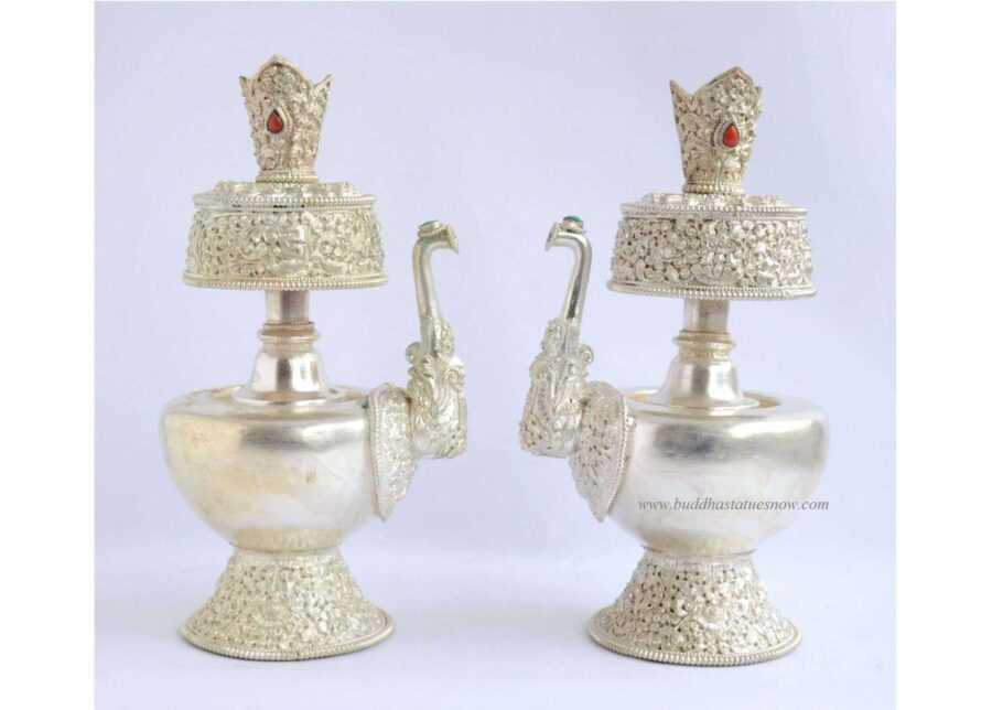 A ritual vase is known as “Bhumpa” in Tibet. They are used to hold consecrated water that is then used to purify person, place of object. Common practice includes purification of new disciples, houses, holy places and public buildings. The Tibetan Bhumpa set includes two vases because one of them is the “working vase” and the other is “principle vase”. As a result, the working vase is used during the purification ritual to dispense the water and the principle Bhumpa stays on the altar for ceremonial purposes. Our Tibetan Bhumpa sets are crafted in Patan, Nepal by world class artisans who have been practicing their trade for many generations. Therefore, you can rest assured that you have purchased a world class item.