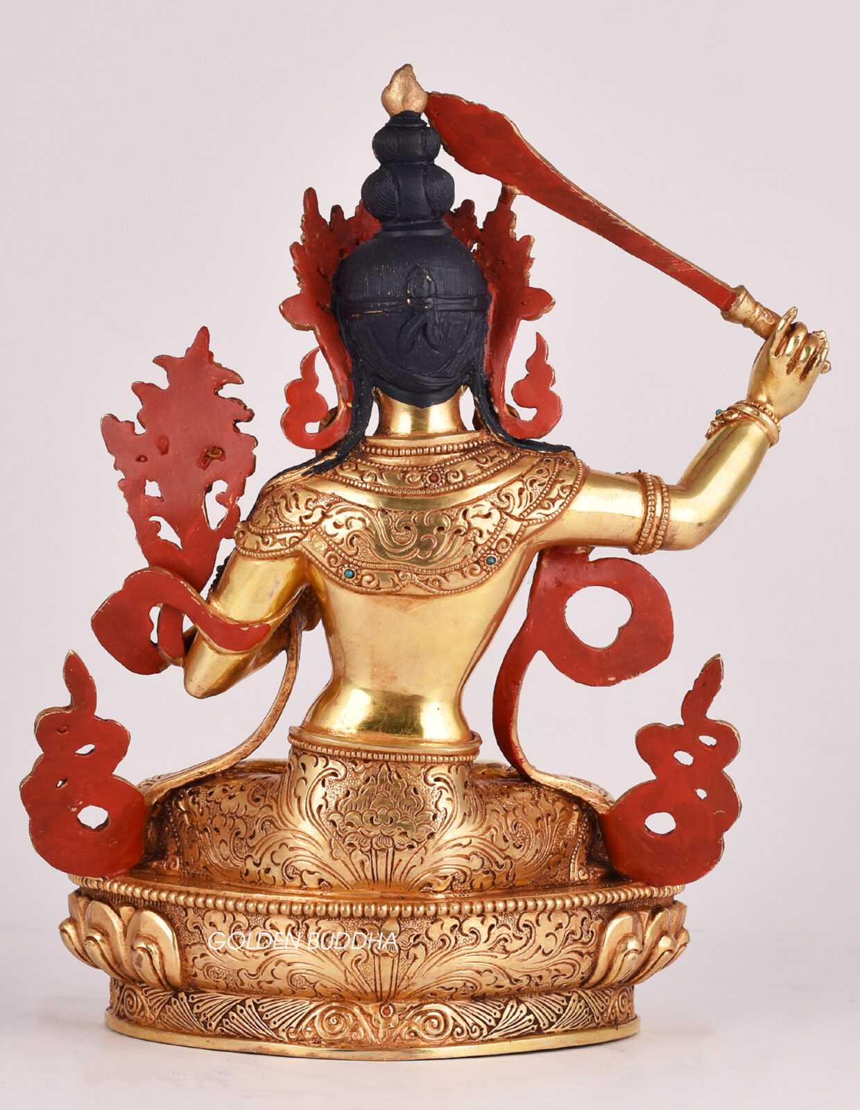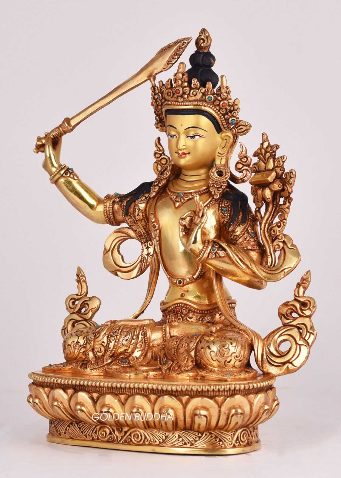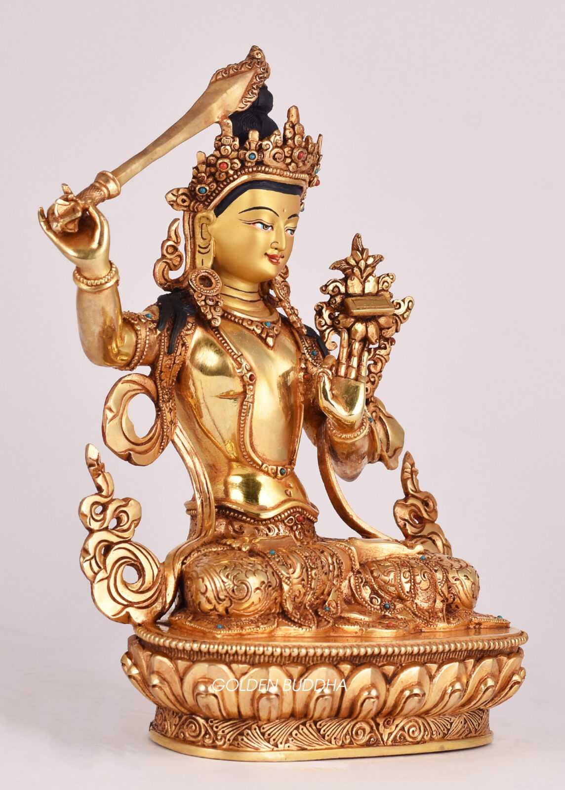 Fully Gold Gilded 9.25″ Manjushri Statue, Fire Gilded in 24K Gold, Handmade in Patan, Nepal