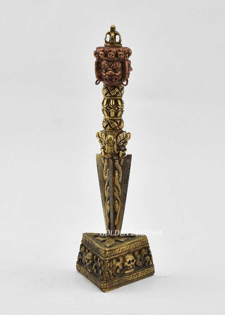Our handmade Tibetan Phurba set is 9.75 inches in height and is gold plated in 18K gold. The item was hand carved in Patan, Nepal using the traditional lost wax sculpting method. Indeed, for many centuries the Nepali artisans have been the preferred source of Tibetan ritual items for the Tibetan monasteries. As a result, the buyer can rest assured that they have purchased an authentic monastic quality Phurba set.