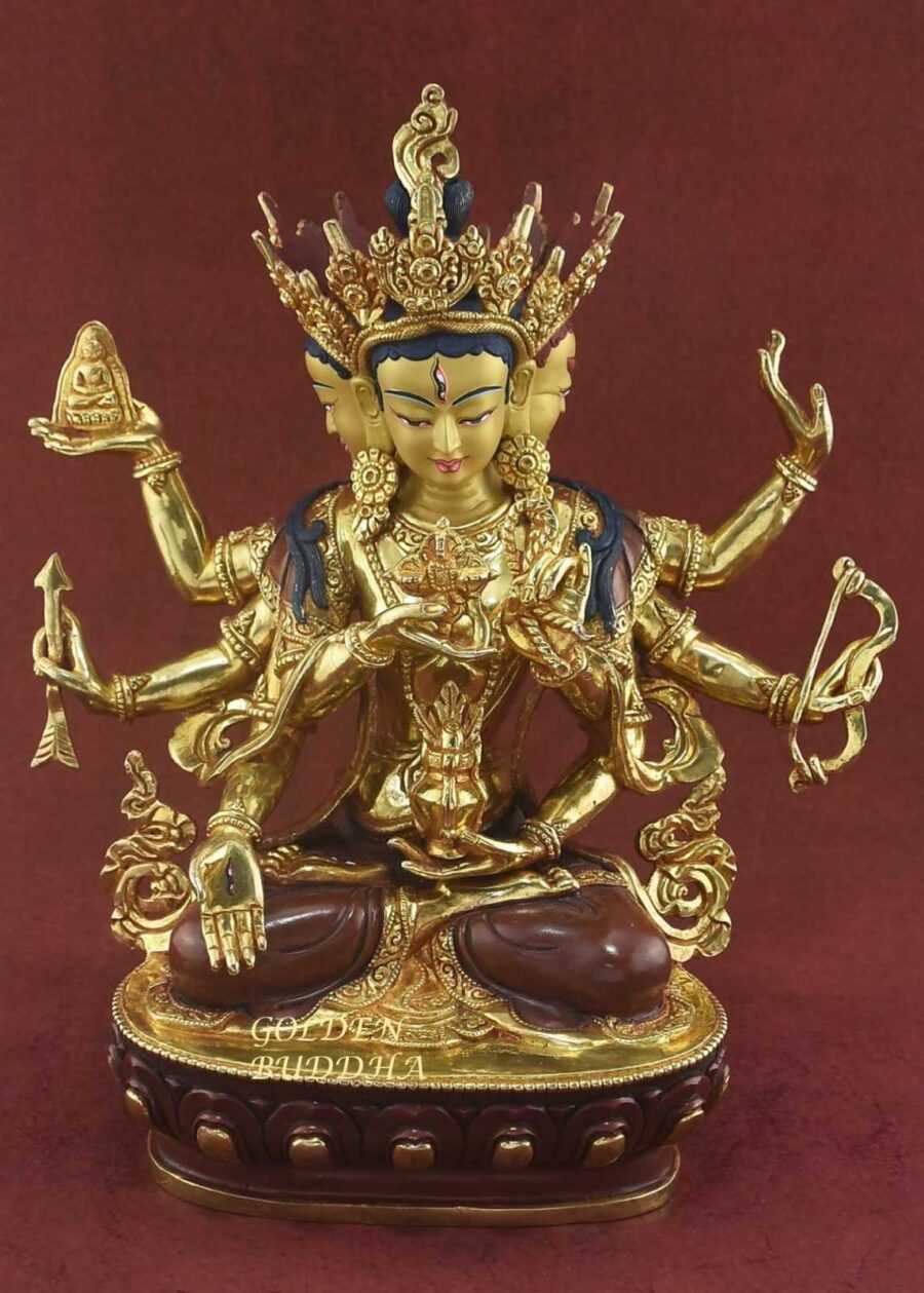 The Nepali artisans adhere to special requirements for Usnisavijaya statues which are listed in the sutra of measurements for the construction of statues. Therefore, she is portrayed with the facial features of a young woman no more than 16 years of age. Additionally, her fantastic features include eight arms and three faces. Click here to learn more about the Nepali artisans.