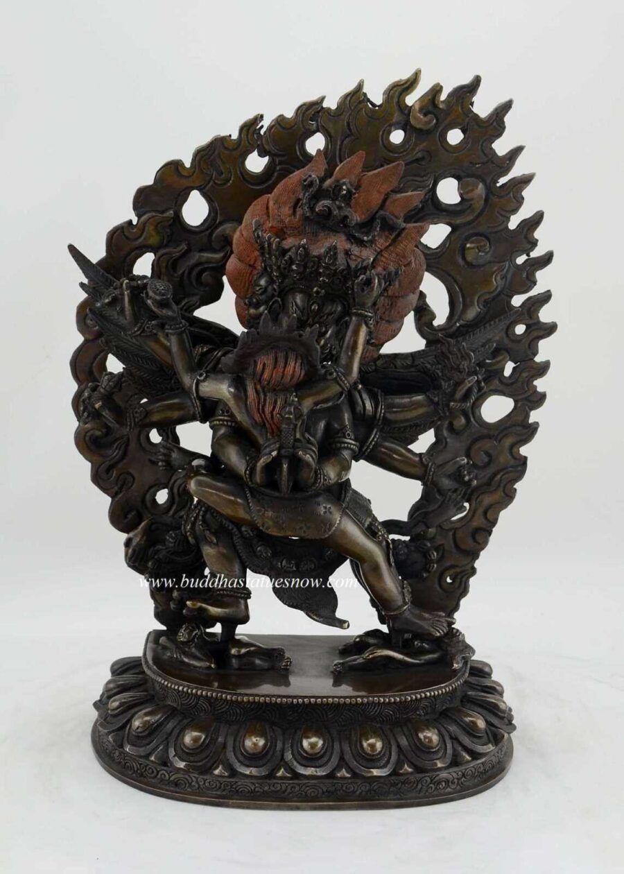 This Vajrakilaya statue has 3 heads, 6 arms and 4 legs. Plus, he is seen in union with his consort Khorlo Gyedunma. The central aspect of the statue is his two main hands wrapped around the consort’s waist. Between these two hands he is holding the magical phurba dagger with 3 blades and magical tip. Each blade of the phurba dagger eliminates one of the three primary hindrances to spiritual realization. These three hindrances being hatred, sensuous desire and ignorance. Additionally, the three point tip of the phurba dagger symbolizes the point of unhindered concentration which is focused on the great emptiness phenomenon.