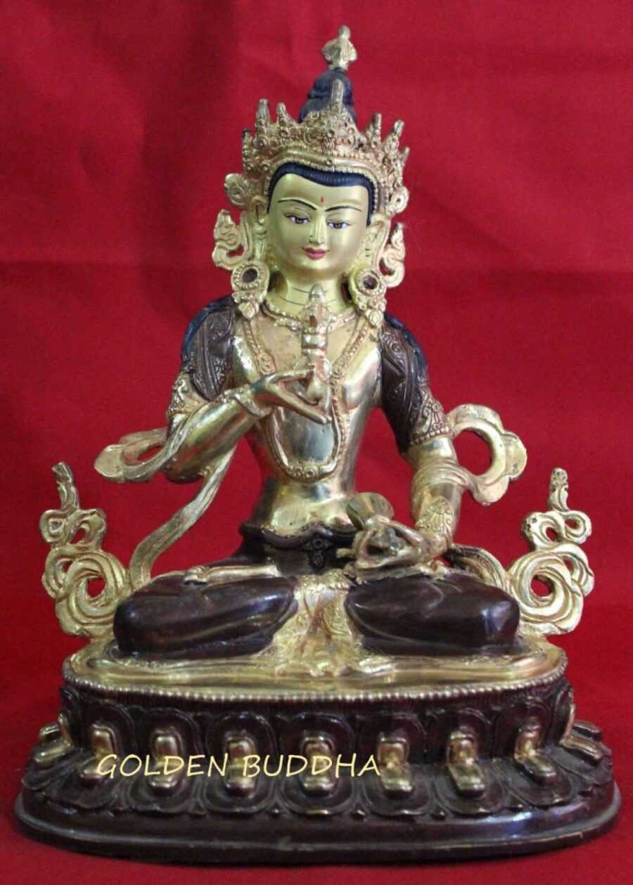 Each Nepali statue was hand crafted using the traditional lost wax method. Additionally, the statue is hand face painted which brings life like expression to the statue. Furthermore, this beautiful sculpture is depicted with the Vajra in his right hand and the Ghanta bell in his left hand. These are very significant Buddhist symbols. The Ghanta is the symbol for the feminine attribute of wisdom. Also, the vajra is the symbol for the masculine attribute of compassion. The combination of these two attributes has been described as the state of Nirvana.