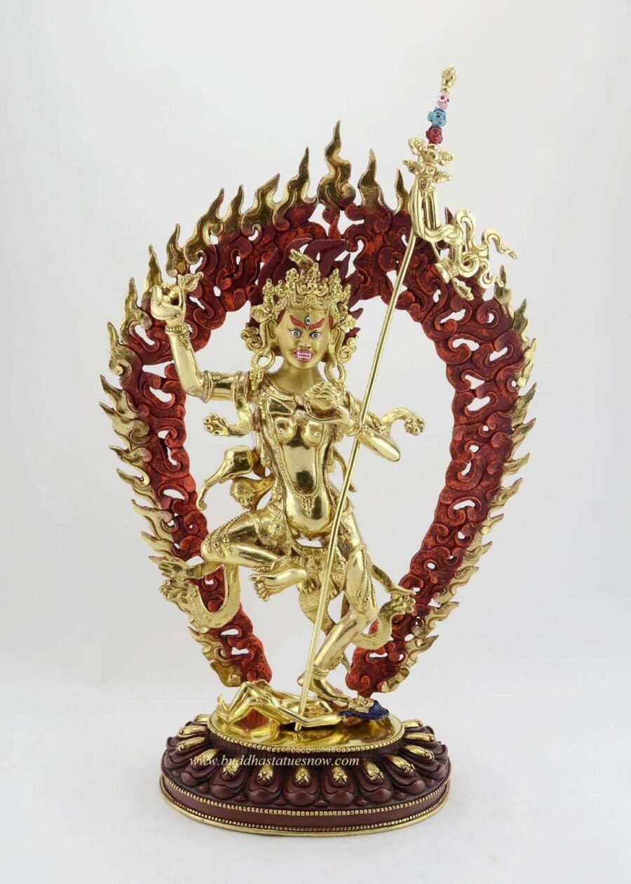 This Vajravarahi statue stands within the flames of pristine awareness and she dances in Dakini style on a human corpse (negativity). Additionally, she rests the khatvanga against her left shoulder. On the tip of the khatvanga three skulls are impaled representing total liberation from the 3 worlds (Trailokya).