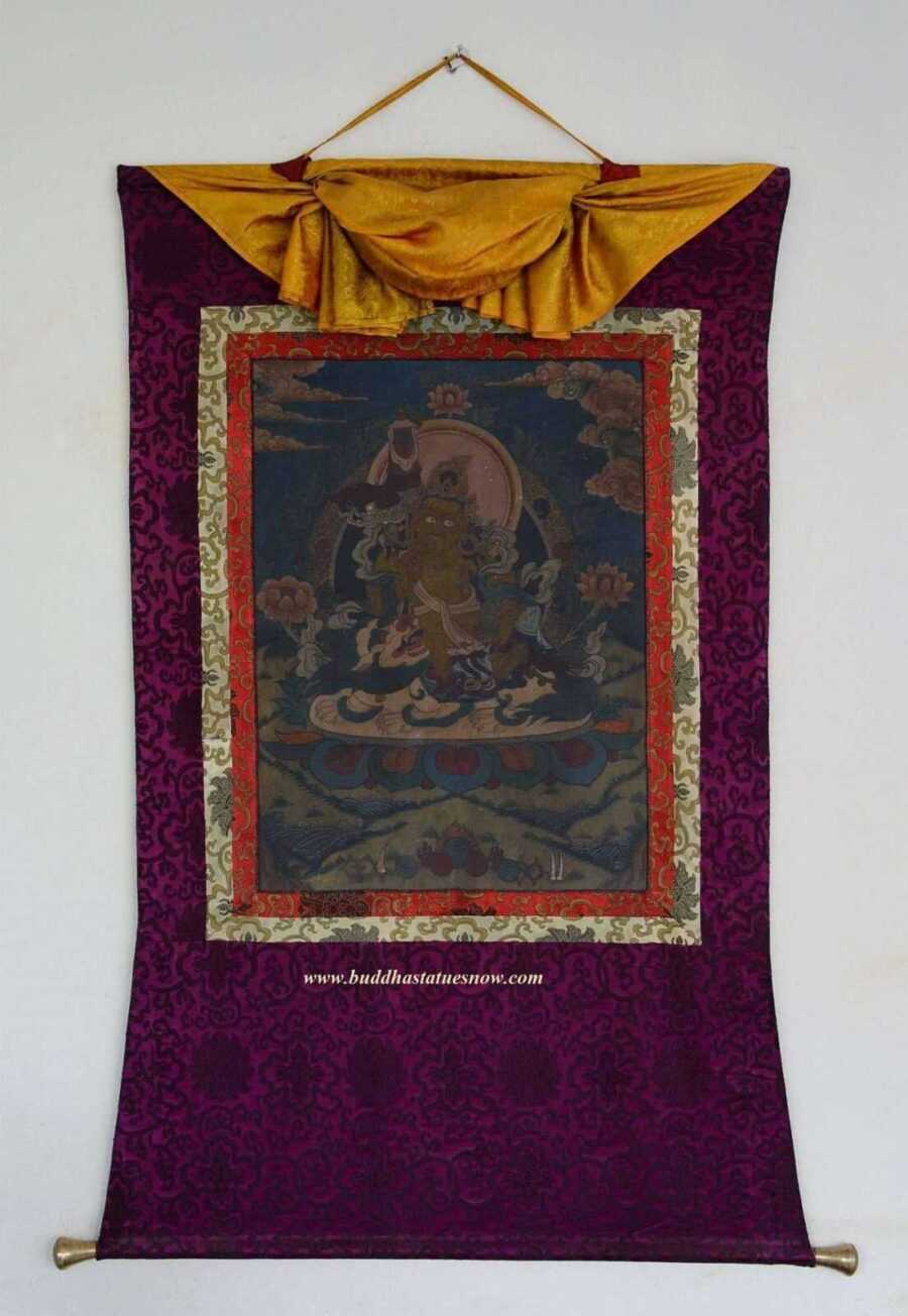 Yellow Dzambhala is a Bodhisattva that is venerated in Tibetan Buddhist beliefs. He is one of five Jambhalas and he is associated with the Buddhist virtue of equanimity. Additionally, he is an embodiment of the Buddha Ratsnasambhava who is one of the Five Wisdom Tathagatas. This makes Dzambhala a member of the “jewel” family. Indeed, “Ratsna” is the Sanskrit word for jewel. Our Yellow Dzambhala Tibetan Thangka painting represents the eradication of poverty and hardship. He also encourages devotees to enrich themselves with the Dharma teachings.